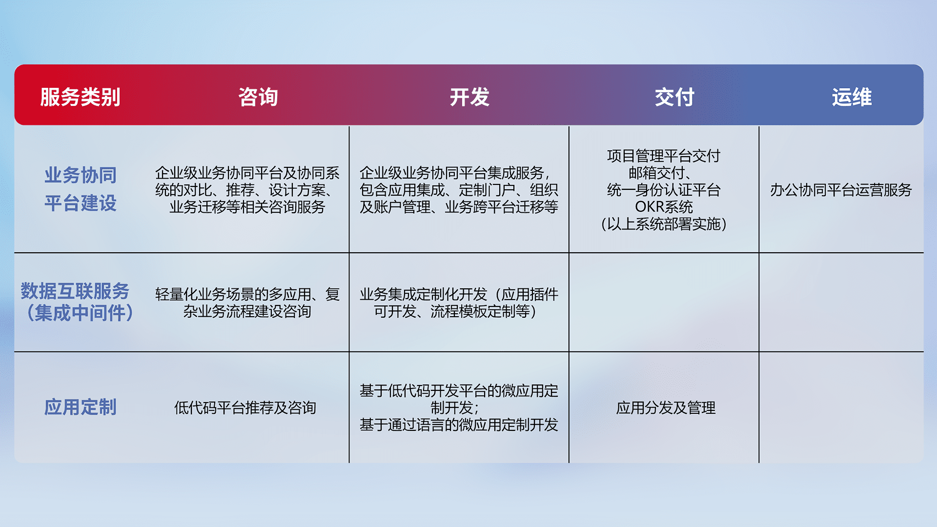 针对钉钉、、、、企微、、、、IDaas等平台级产品提供产品的规划、、、方案、、、交付、、定制化开发等服务,,实现如统一协同办公、、、智能客户服务、、、混合会议管理、、、、智能数据查询、、等业务场景,,,,实现数字化转型。。