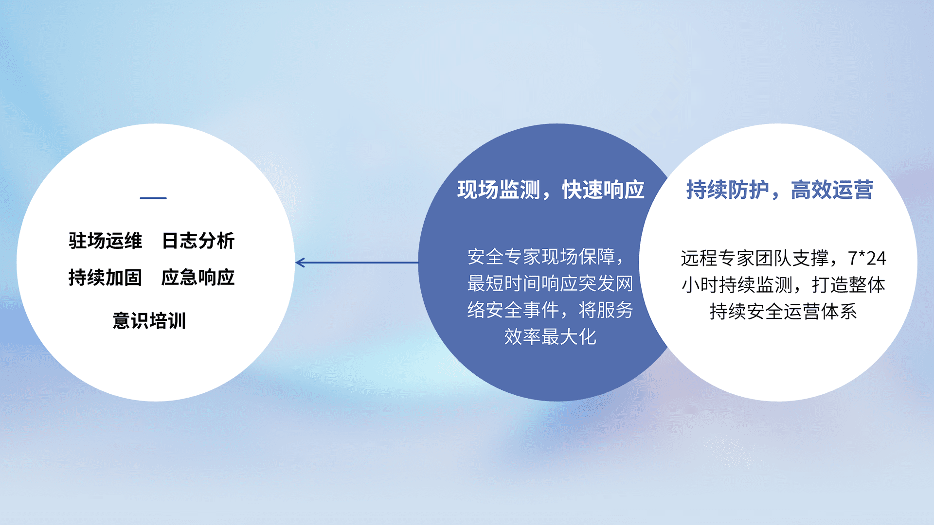 7X24小时持续监测安全事件,保持安全策略有效性,降低资产脆弱性风险,,精准拦截黑客攻击,,,,减少被黑客利用的机会,,,,第一时间遏制,,,降低损失。。